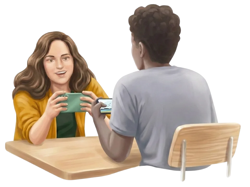 · Kvinden med [det brune hår].· Manden som [sidder på den røde stol].
